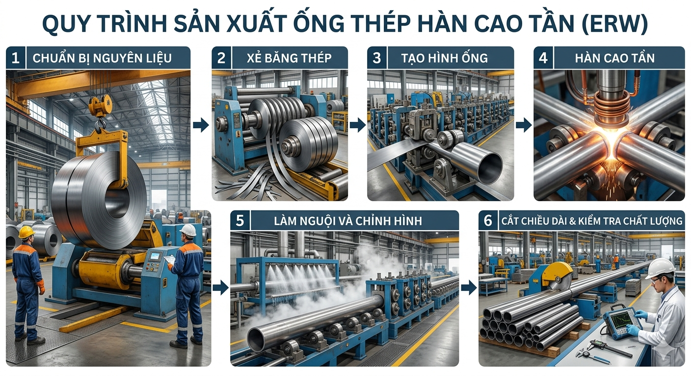 ERW (Electric Resistance Welding) là công nghệ hàn điện trở cao tần sử dụng dòng điện tần số cao để làm nóng chảy mép thép, sau đó ép lại tạo thành mối hàn.