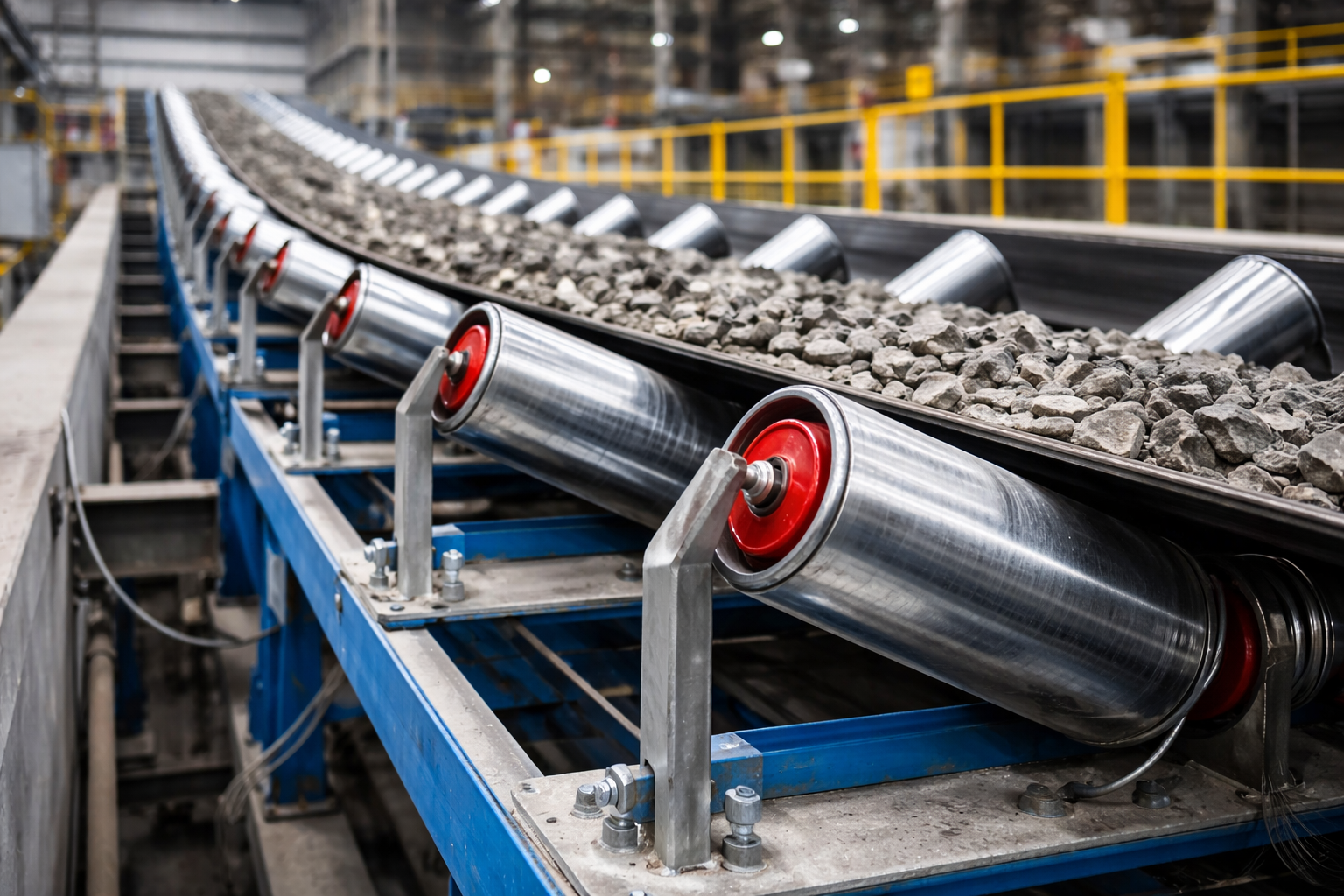 Dải thép được đưa qua hệ thống con lăn để uốn dần thành hình tròn.