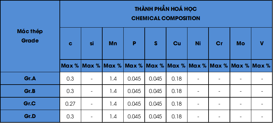 Tính chất cơ học: Tiêu chuẩn đưa ra các yêu cầu về tính chất cơ học, bao gồm độ bền kéo tối thiểu, giới hạn chảy và độ giãn dài của thép. Các giá trị này khác nhau đối với từng cấp độ (Grade A, B, C) và đảm bảo rằng sản phẩm có thể chịu được các điều kiện làm việc khắc nghiệt trong các ứng dụng kết cấu.