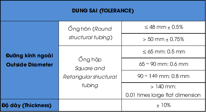 Dung sai kích thước và hình dạng: ASTM A500 quy định dung sai về kích thước, bao gồm dung sai về đường kính, độ dày thành ống và độ thẳng của ống thép. Điều này đảm bảo rằng sản phẩm đạt độ chính xác cao và phù hợp với các yêu cầu kỹ thuật của công trình xây dựng.